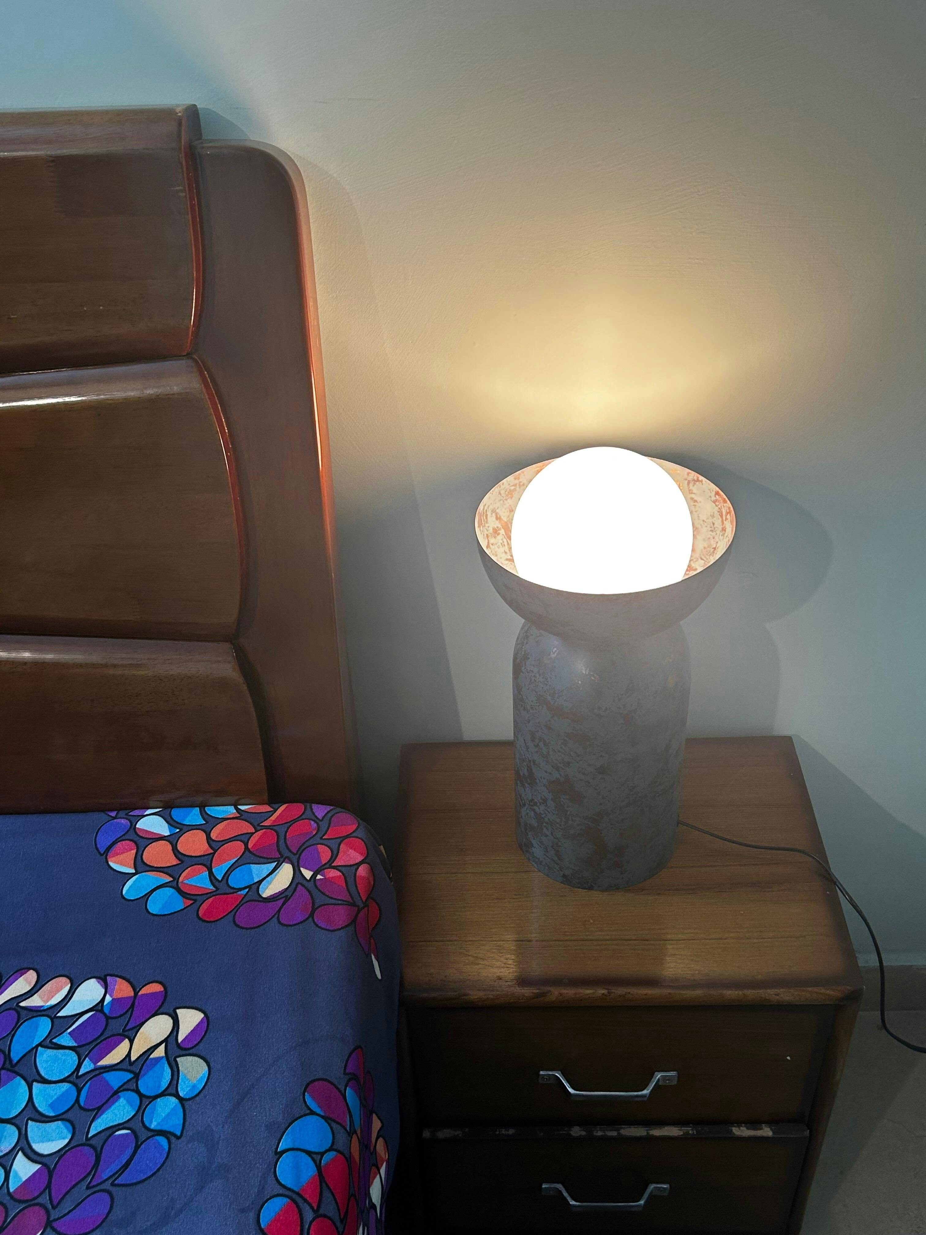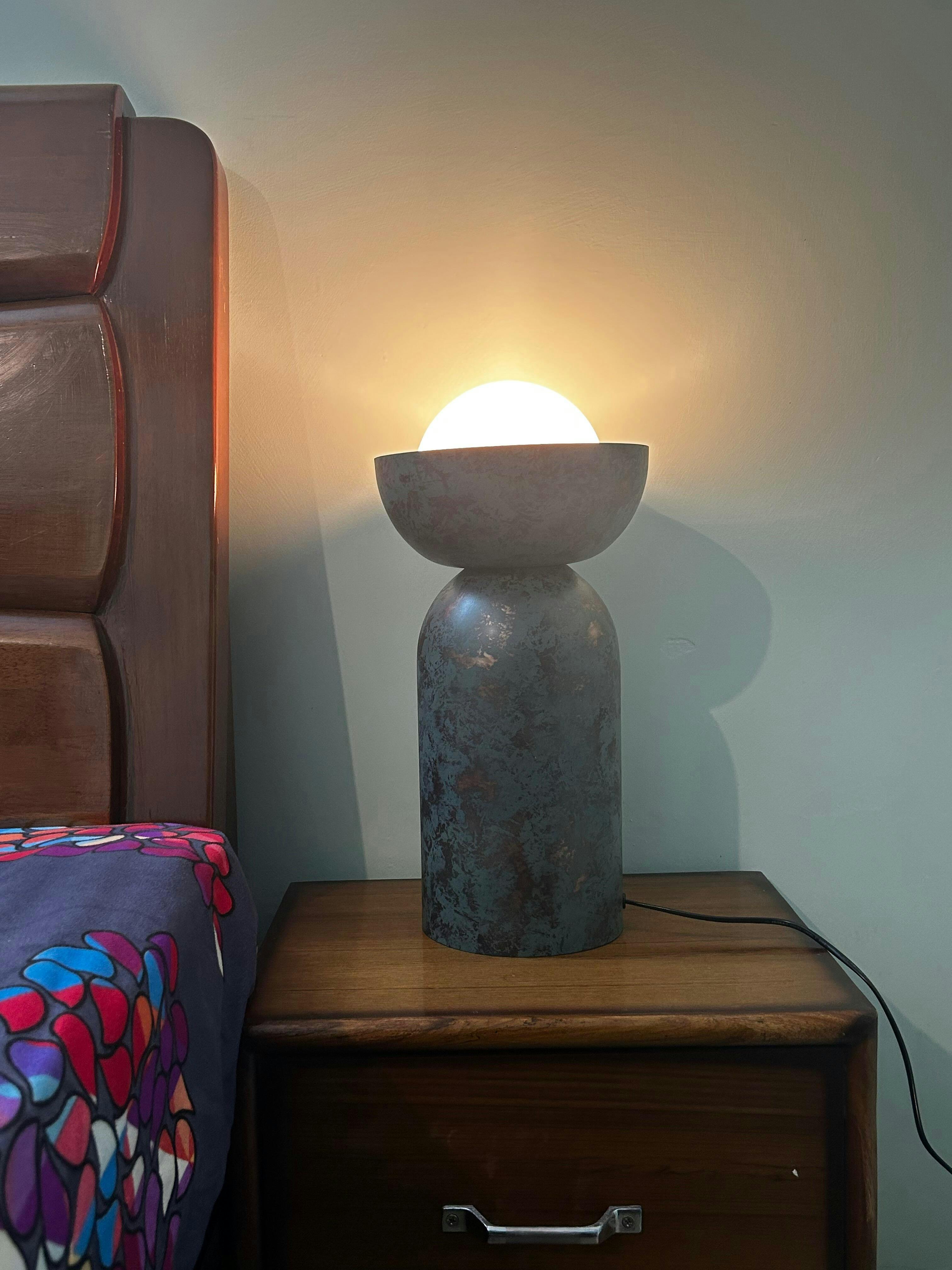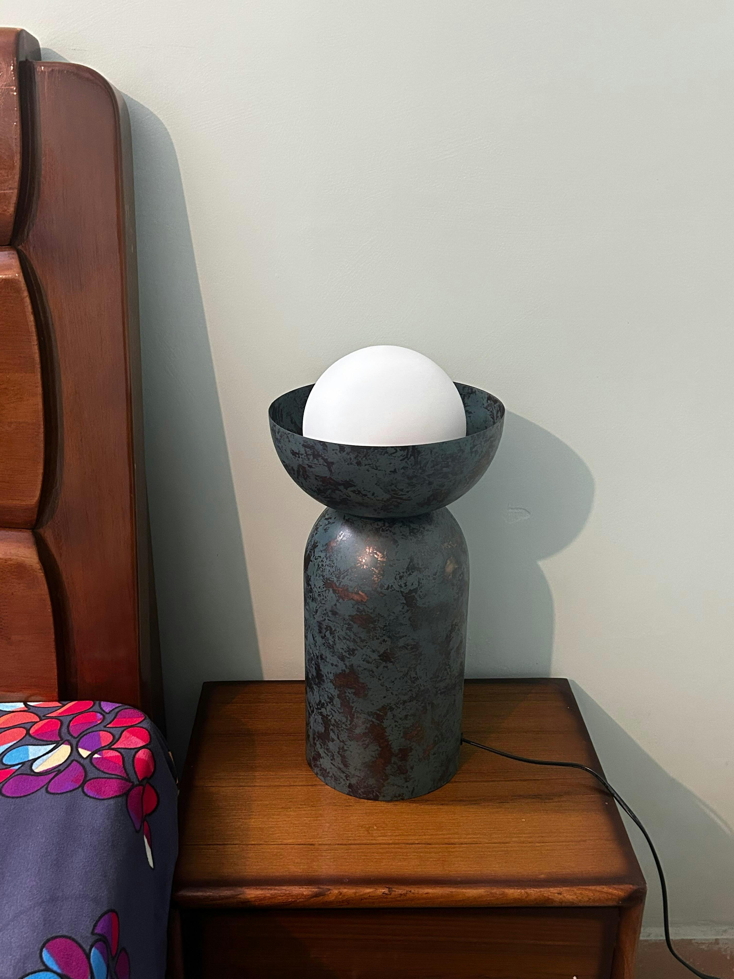 Introducing "The Eclipse Table Lamp," a piece born from the fusion of art and astronomy, capturing the mesmerising beauty of celestial events. Imagine a night where the moon gracefully aligns with the sun, creating an awe-inspiring eclipse. This enchanting moment is encapsulated in the design of our lamp, where a rounded base and a bowl-like top merge to cradle a luminous orb, much like the moon nestled in the shadow of the earth. Crafted from high-quality metal with a rich patina finish, the Eclipse Table Lamp radiates a warm, ambient glow that transforms any space into a serene oasis.